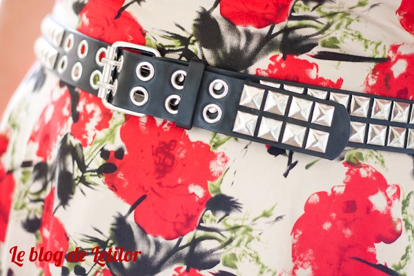 Pour casser le côté « sage » de l’imprimé fleuri crème et rouge, j’ai suivi l’inspiration du catalogue ASOS en y ajoutant une touche rebelle. Le secret ? Le rappel des studs (clous).