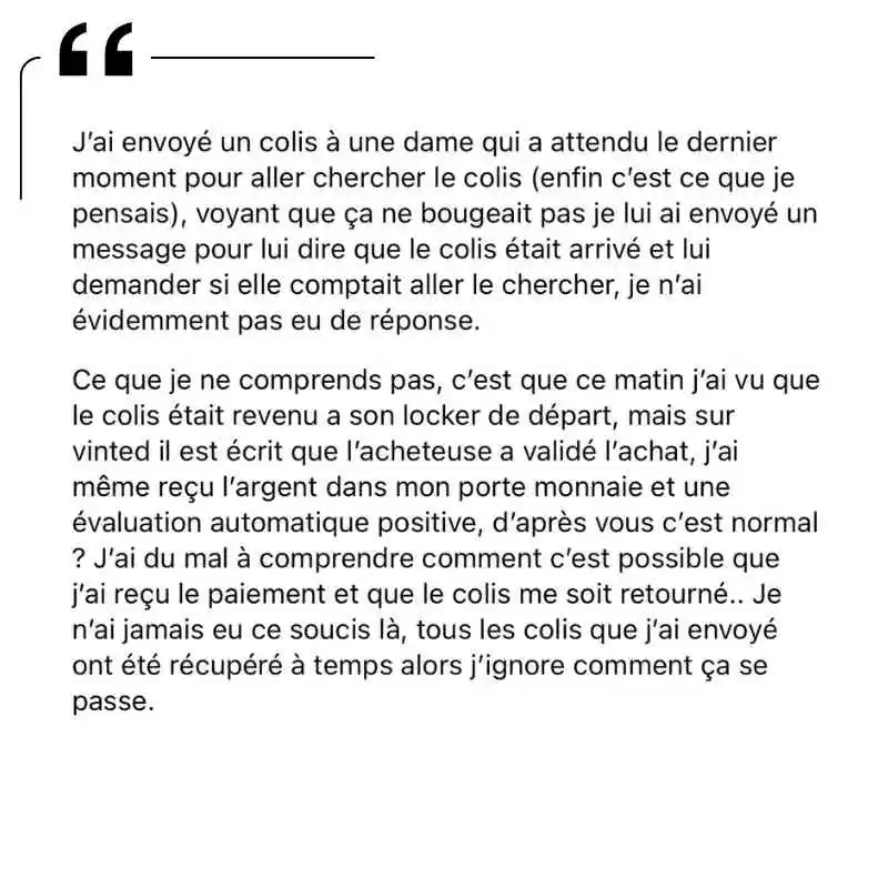 Dans ce cas-ci, la personne n’a jamais récupéré le colis, mais les notifications automatiques ont fait que la transaction s’est validée.