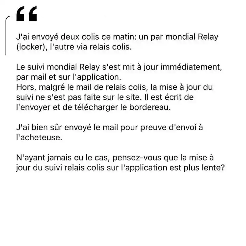 Pour le vendeur : le suivi (tracking) peut mettre jusqu’à plusieurs jours pour se lancer : quatre ou cinq jours. S’il y a un souci au moment du dépôt (mal scanné), le colis sera scanné plus loin dans la chaîne logistique et le suivi n’apparaîtra qu’à ce moment. Il y a souvent des soucis, surtout avec les lockers.